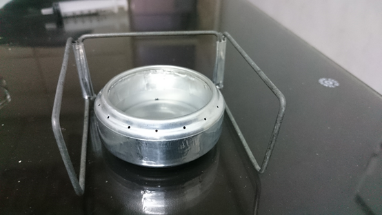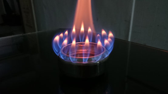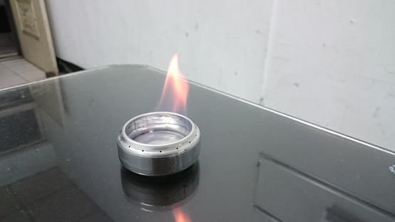 開始加入酒精試燒,這款酒精爐是要靠中間的火焰來加熱內層的酒精,使酒精受熱膨脹成蒸氣後從周圍小孔噴射出來,有點像瓦斯爐,一開始燃燒初期需要預熱,等預熱完成後,火焰便會從小孔噴發出來,形成美麗火焰