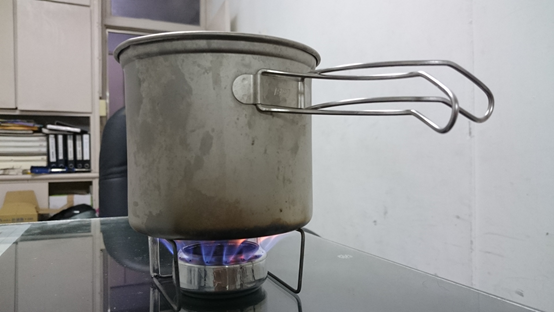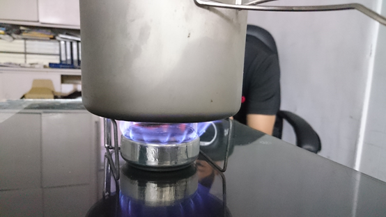 再來便是試試看燒開水,取500cc的自來水試燒,沒有加檔片跟鍋蓋,這次加了約23cc的酒精,開始點火並計時